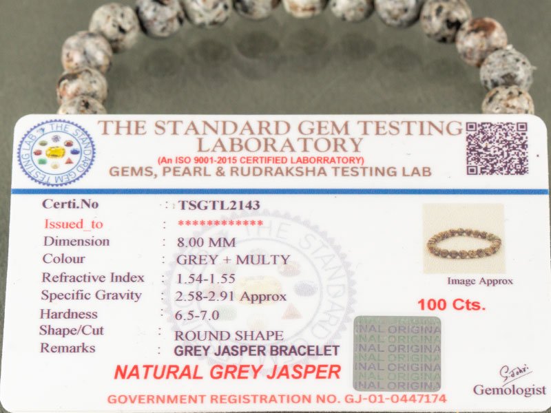 We guarantee quality. Every bracelet is accompanied by an ISO 9001:2015 certified lab report (Certificate No: TSGTL2143), proving it is Natural Grey Jasper and not a synthetic imitation.