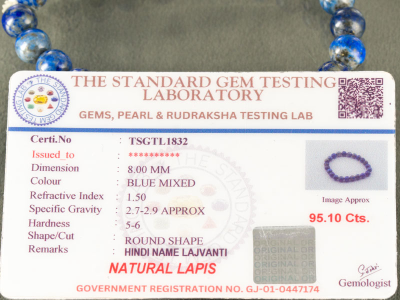 We guarantee quality. Every bracelet is accompanied by an ISO 9001:2015 certified lab report (Certificate No: TSGTL1832), proving it is Natural Lapis and not dyed Sodalite or synthetic imitation.