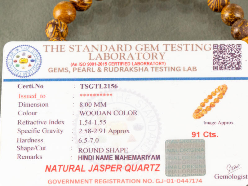 We guarantee quality. Every bracelet is accompanied by an ISO 9001:2015 certified lab report (Certificate No: TSGTL2156), proving it is Natural Jasper Quartz (Mahemariyam).