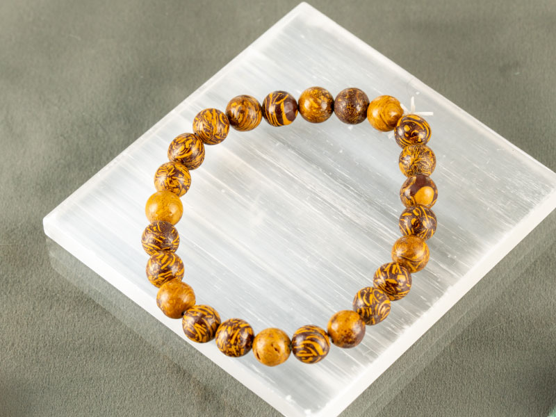 If you are looking to buy Mahemariyam bracelet online, Ratna Gems offers this rare and intriguing accessory. Also known as “Calligraphy Stone” or “Miriam Stone,” this bracelet is crafted from Natural Jasper Quartz. It features polished 8mm beads with a “Woodan Color” profile—golden yellow backgrounds with intricate brown lines that resemble handwriting or ancient fossils. Weighing approximately 91 carats, each bead is a unique piece of art.