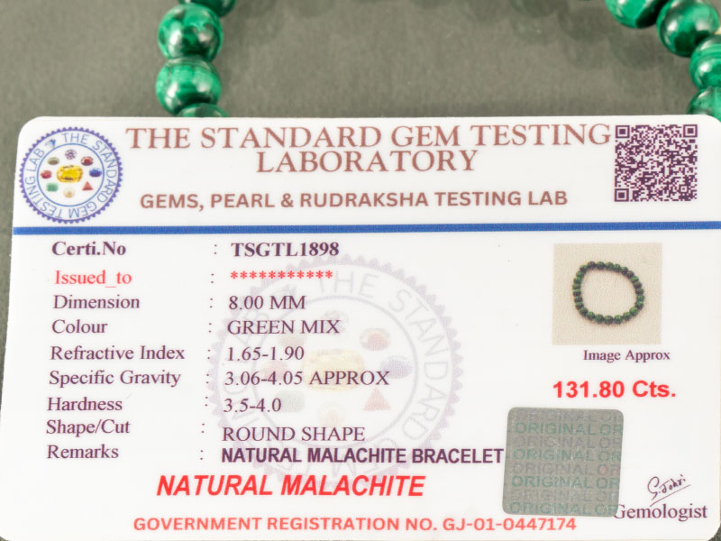 We guarantee quality. Every bracelet is accompanied by an ISO 9001:2015 certified lab report (Certificate No: TSGTL1898), proving it is Natural Malachite and not green plastic or dyed resin.