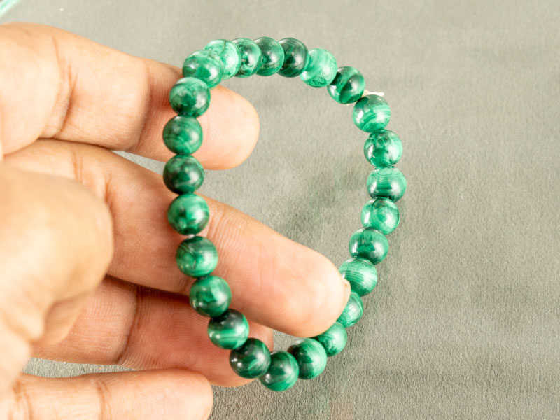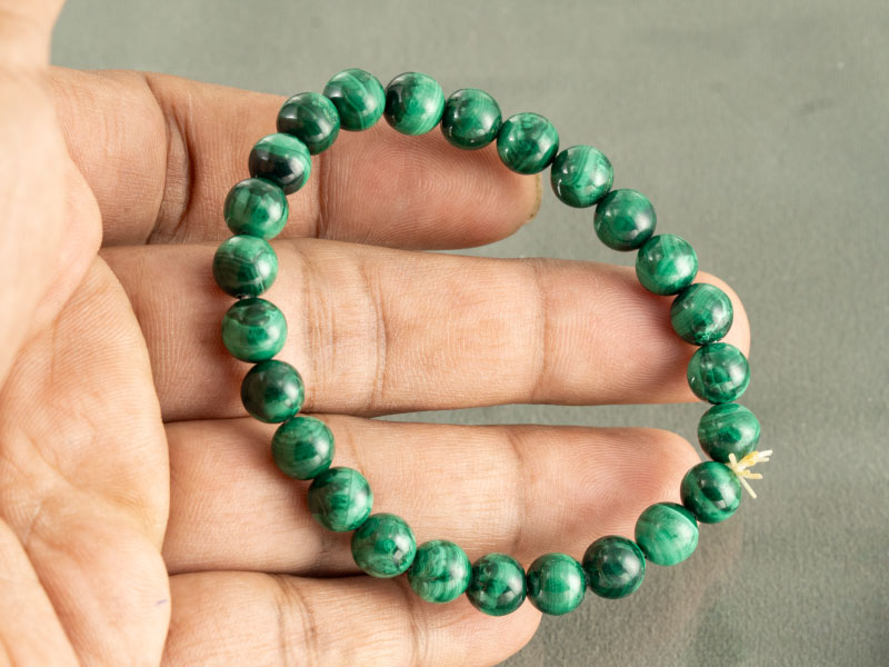If you are looking to buy Malachite bracelet online, Ratna Gems offers this premium accessory crafted from genuine Natural Malachite. This bracelet features polished 8mm beads with a “Green Mix” color profile—stunning bands of light and dark emerald green. Weighing a substantial 131.80 carats, this bracelet has the distinct heavy feel of real copper-based minerals.