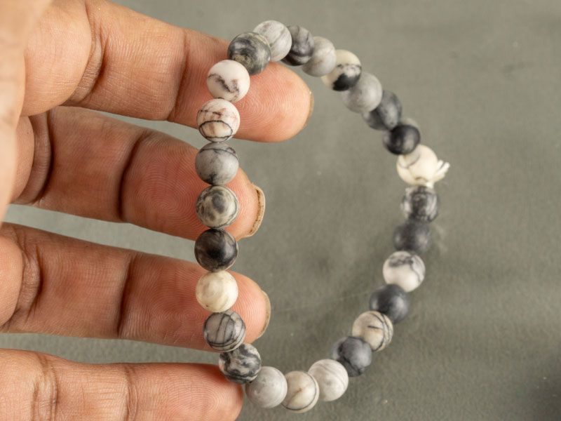 This Natural Spider Web Agate bracelet is crafted using genuine quartz-based agate stones, carefully shaped into smooth, polished 8mm round beads. The bracelet displays unique grey, white, and black spider web-like patterns, making every piece naturally distinctive. It weighs approximately 110 carats and is strung on a durable elastic thread for a comfortable fit.